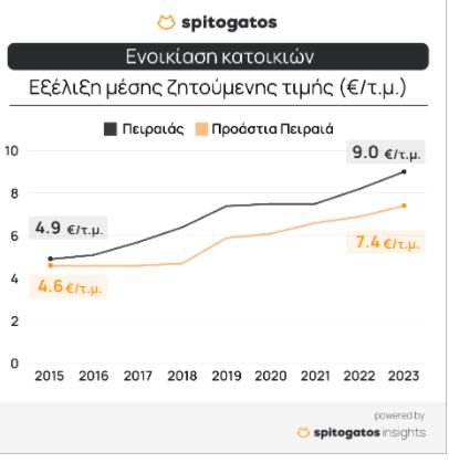Η μέση ζητούμενη τιμή ενοικίασης κατοικιών στον Πειραιά αυξήθηκε κατά 10% το 2023 σε σύγκριση με το προηγούμενο έτος, ενώ στα Προάστια του Πειραιά η μέση ζητούμενη τιμή ενοικίασης κατοικίας αυξήθηκε κατά 7,6%.