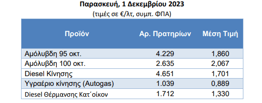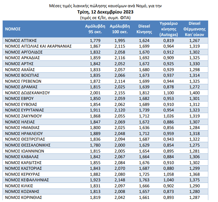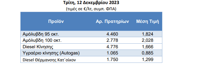 Συγκρίνοντας τις τιμές της 12ης Δεκεμβρίου με τις αντίστοιχες την 1η Δεκεμβρίου, διαπιστώνουμε ότι η μέση τιμή πώλησης πανελλαδικά είναι μειωμένη κατά 0,04 ευρώ.