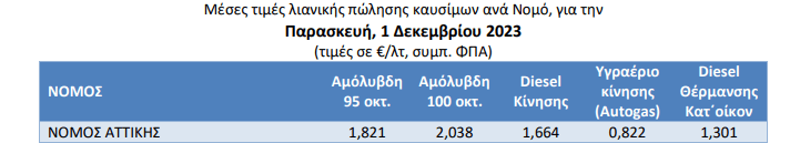 Στον νομό Αττικής η μέση τιμή είναι χαμηλότερη από τον πανελλαδικό μέσο όρο. Την απλή αμόλυβδη τη βρίσκουμε στη μέση τιμή των 1,779 ευρώ -μετά από μεγάλο χρονικό διάστημα κάτω από το 1,80. Την 1η Δεκεμβρίου η τιμή της απλής αμόλυβδης ήταν στα 1,821 ευρώ.