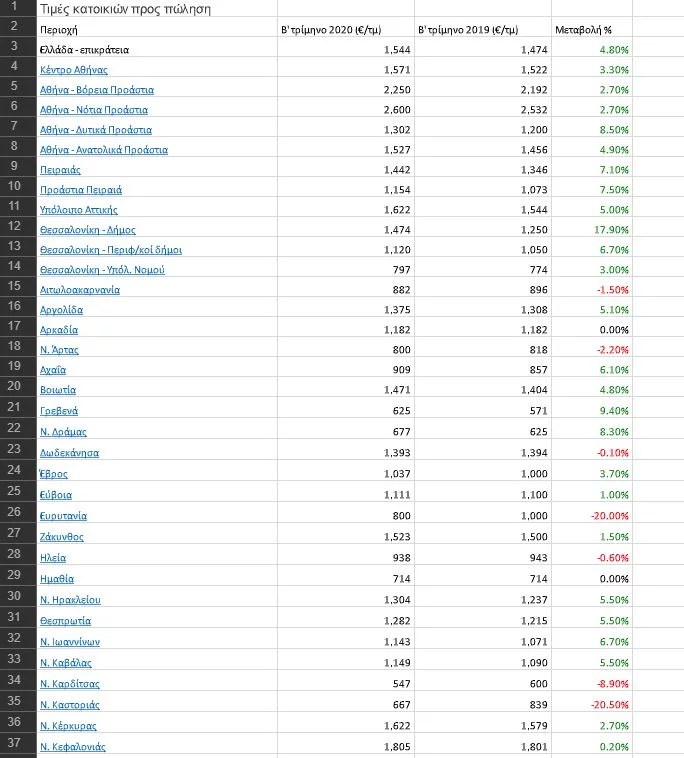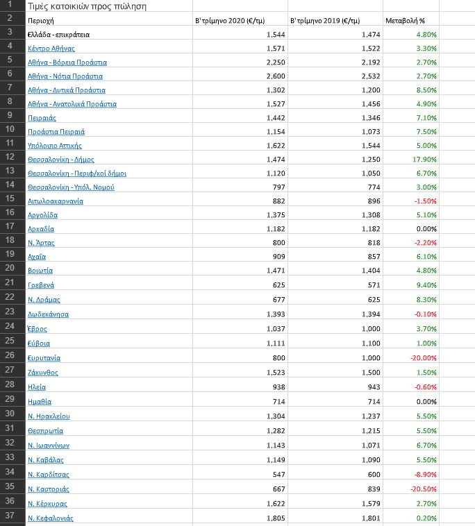 Στα καθ’ ημάς, τα στοιχεία από την αγορά επιβεβαιώνουν ότι η ζήτηση και οι τιμές «φρέναραν», ωστόσο επ’ ουδενί καταγράφεται πτωτική τάση, παρά μόνο σε συγκεκριμένες περιοχές της περιφέρειας. Σύμφωνα με τα στοιχεία του spitogatos, τα οποία καλύπτουν την περίοδο της καραντίνας, οι τιμές στο σύνολο της επικράτειας σημείωσαν άνοδο κατά 4,80% σε σχέση με το β’ τρίμηνο του 2019.
