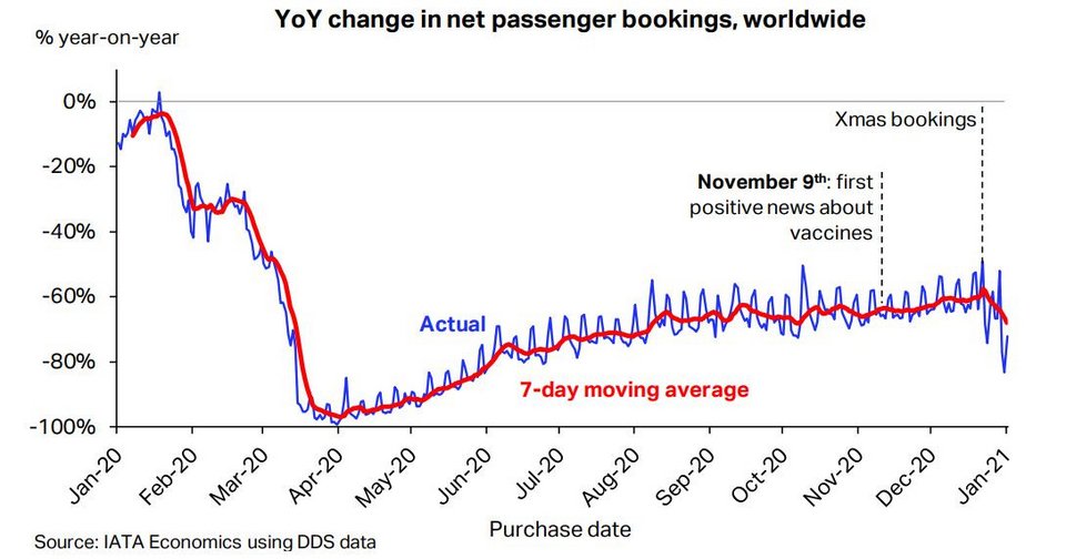 Αυτήν τη στιγμή οι κρατήσεις είναι στο απόλυτο «0» και το μόνο που υπάρχει είναι τα περσινά voucher από τα ακυρωμένα ταξίδια, τα οποία φυσικά είναι πληρωμένα άρα στο ταμείο μικρών και μεγάλων καταλυμάτων δεν μπαίνει απολύτως τίποτα. Τα στοιχεία από τη Διεθνή Ένωση Αερομεταφορών (ΙΑΤΑ) επιβεβαιώνουν αυτήν την εικόνα, καθώς μετά από ένα «σκίρτημα» στις πρώτες εβδομάδες του Δεκεμβρίου, καταγράφεται «βουτιά» των κρατήσεων μετά τις 23 Δεκεμβρίου. Ο λόγος; Η «επίθεση» του κορωνοϊού με μεταλλάξεις σε βασικές αγορές και οι νέοι περιορισμοί στις μετακινήσεις. Σύμφωνα με τα στοιχεία του ΠΟΥ, την τελευταία εβδομάδα του Δεκεμβρίου περίπου 4,1 εκατομμύρια άνθρωποι βγήκαν θετικοί στα Covid tests, δηλαδή οι διπλάσιοι από το Σεπτέμβριο!