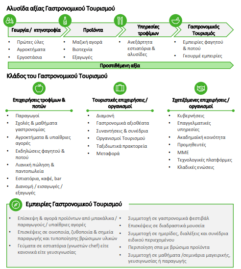 Ως Γαστρονομικός Τουρισμός ορίζεται η συνολική δραστηριότητα που πηγάζει από τη συμμετοχή των επισκεπτών σε εμπειρίες γαστρονομικού ενδιαφέροντος – ως οριζόντιο στοιχείο που εμπλουτίζει και ενισχύει όλες τις μορφές του τουριστικού προϊόντος. Ειδικά όσον αφορά στον Οινοτουρισμό, καλύπτει την παροχή υπηρεσιών υποδοχής, ξενάγησης, φιλοξενίας και εστίασης σε χώρους λειτουργικά ενοποιημένους με οινοποιητικές ή / και οινοπαραγωγικές (αμπελώνες) εγκαταστάσεις, ενώ οι υπηρεσίες αυτές προσφέρονται συνδυαστικά με δραστηριότητες σχετικές με την αμπελοκαλλιέργεια και την οινική παραγωγή.