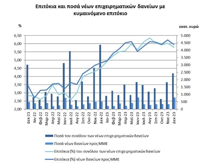 Το μέσο επιτόκιο των νέων επιχειρηματικών δανείων με συγκεκριμένη διάρκεια και κυμαινόμενο επιτόκιο μειώθηκε κατά 26 μονάδες βάσης, το Δεκέμβριο του 2023, και διαμορφώθηκε στο 5,78%. Το μέσο επιτόκιο των δανείων τακτής λήξης με κυμαινόμενο επιτόκιο προς μικρομεσαίες επιχειρήσεις (ΜΜΕ) μειώθηκε κατά 28 μονάδες βάσης και διαμορφώθηκε στο 5,95%.