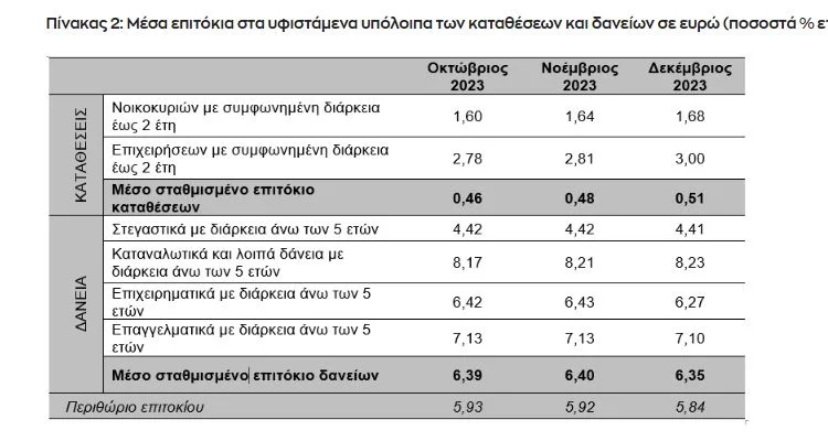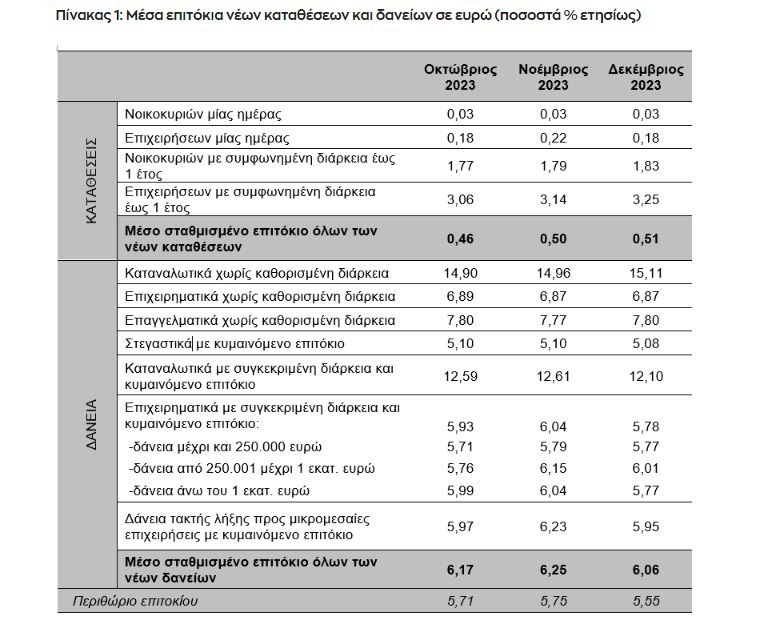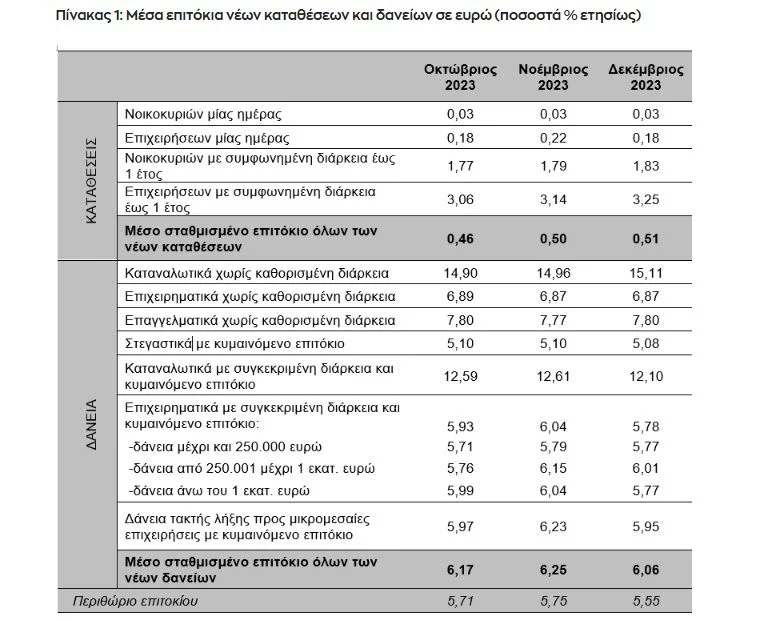 Τον Δεκέμβριο του 2023, το μέσο σταθμισμένο επιτόκιο των νέων καταθέσεων παρέμεινε σχεδόν αμετάβλητο στο 0,51%, ενώ το αντίστοιχο επιτόκιο των νέων δανείων μειώθηκε στο 6,06%, σύμφωνα με στοιχεία της Τράπεζας της Ελλάδος.Το περιθώριο επιτοκίου μεταξύ των νέων καταθέσεων και δανείων μειώθηκε στις 5,55 εκατοστιαίες μονάδες.