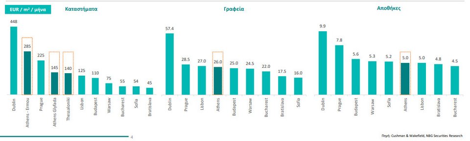 Ειδικότερα, η Ελλάδα παρουσιάζει υψηλά μισθώματα ανά τ.μ. το μήνα και υψηλότερες αποδόσεις σε όλες τις κατηγορίες ακίνητων σε σχέση με τις αγορές της Ευρώπης (εκτός Μ. Βρετανίας). Είναι ενδεικτικό ότι ένα κατάστημα στην Ερμού “δίνει” 285 ευρώ/τμ το μήνα, όταν ένα αντίστοιχο στη Λισαβόνα “δίνει” λιγότερα από τα μισά.
