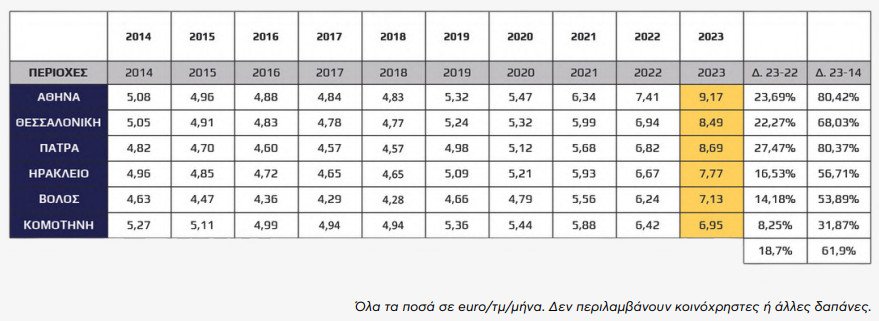 Όσο για τα περσινά, ήδη πολύ υψηλά επίπεδα, το επίπεδο της αύξησης των ζητούμενων μισθωμάτων προσδιορίζεται μεσοσταθμικά στο 18,7%.