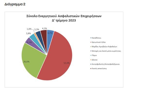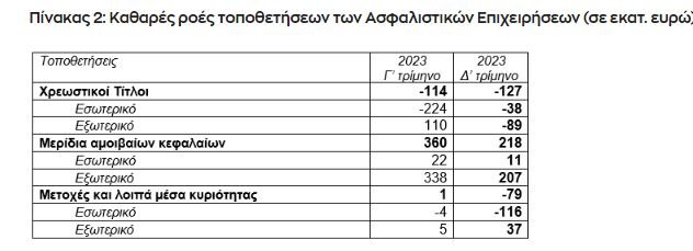 Η αξία των συνολικών τοποθετήσεων των ασφαλιστικών επιχειρήσεων σε χρεωστικούς τίτλους αυξήθηκε στα 10.557 εκατ. ευρώ στο τέλος του δ΄ τριμήνου του 2023, έναντι 10.201 εκατ. ευρώ το προηγούμενο τρίμηνο. Η εξέλιξη αυτή οφείλεται στην αύξηση των αποτιμήσεων τόσο των κυβερνητικών ομολόγων των λοιπών χωρών της ζώνης του ευρώ όσο και του Ελληνικού Δημοσίου. Το ποσοστό των χρεωστικών τίτλων επί του συνολικού ενεργητικού παρέμεινε σχεδόν αμετάβλητο στο 52,0% το δ΄ τρίμηνο.