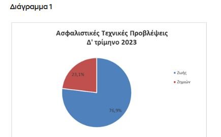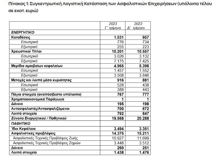Από την πλευρά του παθητικού, τα ίδια κεφάλαια μειώθηκαν στα 3.351 εκατ. ευρώ στο τέλος του δ΄ τριμήνου του 2023, έναντι 3.494 εκατ. ευρώ το προηγούμενο τρίμηνο. Οι ασφαλιστικές τεχνικές προβλέψεις αυξήθηκαν κατά 836 εκατ. ευρώ και διαμορφώθηκαν στα 15.211 εκατ. ευρώ. Οι ασφαλιστικές τεχνικές προβλέψεις ζωής αυξήθηκαν κατά 772 εκατ. ευρώ και διαμορφώθηκαν στα 11.699 εκατ. ευρώ, ενώ οι τεχνικές προβλέψεις ζημιών αυξήθηκαν κατά 64 εκατ. ευρώ και διαμορφώθηκαν στα 3.512 εκατ. ευρώ. Από το σύνολο των τεχνικών προβλέψεων το 76,9% αντιστοιχεί σε τεχνικές προβλέψεις ζωής.