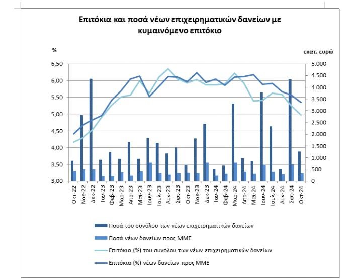 Τον Οκτώβριο του 2024, το μέσο σταθμισμένο επιτόκιο των νέων καταθέσεων παρέμεινε σχεδόν αμετάβλητο στο 0,53%, ενώ το αντίστοιχο επιτόκιο των νέων δανείων μειώθηκε στο 5,41%, σύμφωνα με την Τράπεζα της Ελλάδος.
