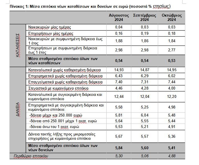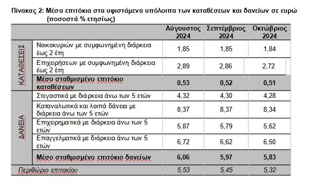 Τον Οκτώβριο του 2024, το μέσο σταθμισμένο επιτόκιο του συνόλου των υφιστάμενων καταθέσεων παρέμεινε σχεδόν αμετάβλητο στο 0,51%, ενώ το αντίστοιχο επιτόκιο των δανείων μειώθηκε στο 5,83%.