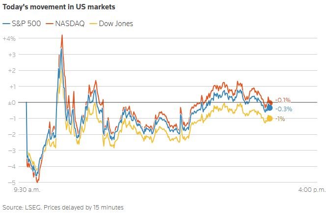 Το πρωί στο χρηματιστήριο της Νέας Υόρκης ήταν «τρελό» αφού οι τρεις βασικοί δείκτες κινήθηκαν μέσα σε λίγα λεπτά από το -4% στο +2% και πάλι στο -2%, εξαιτίας ενός δημοσιεύματος του CNBC και της ακόλουθης άμεσης διάψευσης του Λευκού Οίκου περί «παγώματος» της εφαρμογής των σαρωτικών δασμών από τον Ντόναλντ Τραμπ.