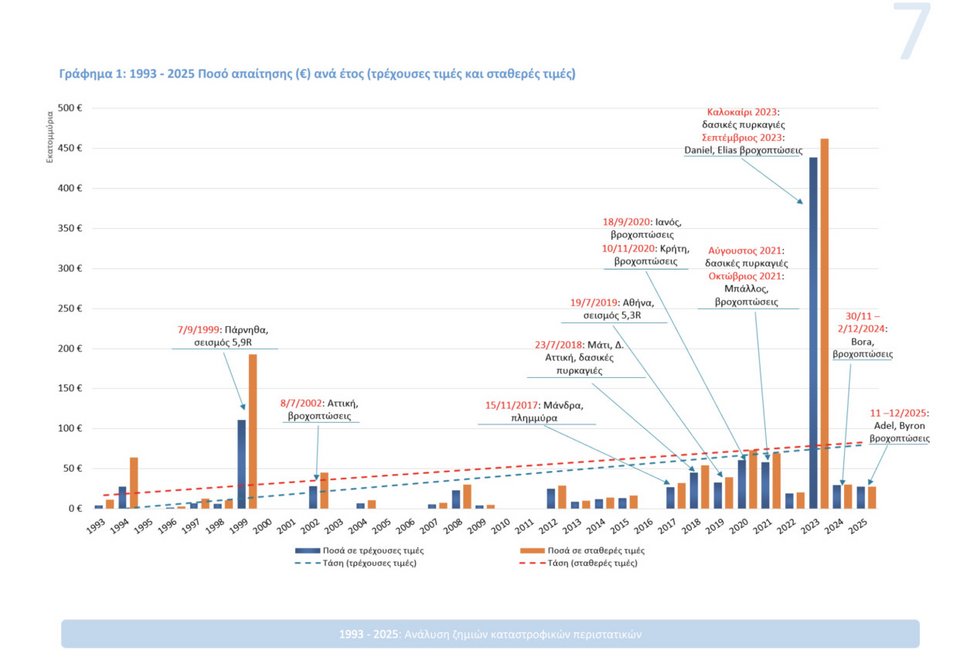 Τα στοιχεία της Ένωσης Ασφαλιστικών Εταιριών Ελλάδος αποτυπώνουν το μέγεθος αυτής της μεταβολής. Την περίοδο 1993–2025 καταγράφηκαν 59 μεγάλα καταστροφικά περιστατικά, τα οποία οδήγησαν σε 56.493 δηλωθείσες ζημιές και συνολικές αποζημιώσεις που ανέρχονται σε 1,03 δισ. ευρώ σε τρέχουσες τιμές και 1,28 δισ. ευρώ σε σταθερές τιμές.