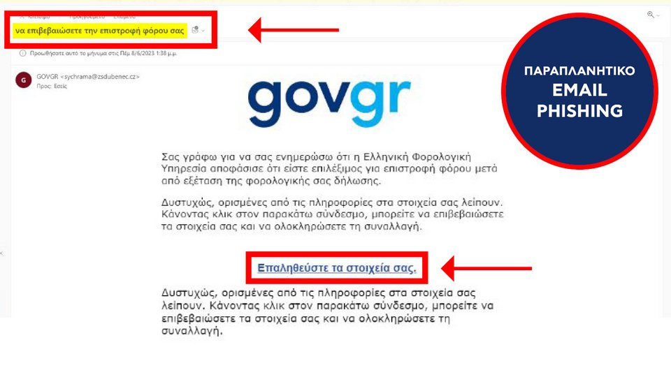 Αυτό που επισημαίνει η ΑΑΔΕ είναι ότι δεν πρόκειται να σας ζητήσει, μέσω μηνύματος ηλεκτρονικού ταχυδρομείου, με κανέναν τρόπο και για κανέναν λόγο να αποκαλύψετε προσωπικά σας στοιχεία, όπως επίσης δεν θα σας αποστείλει ποτέ μήνυμα ηλεκτρονικού ταχυδρομείου με προσωπικά φορολογικά σας δεδομένα (π.χ. ποσά οφειλών ή επιστροφών). Άρα το να πατήσετε το link που λάβατε με ένα τέτοιο μήνυμα, ανοίγει την Κερκόπορτα στους κυβερνοεγκληματίες.