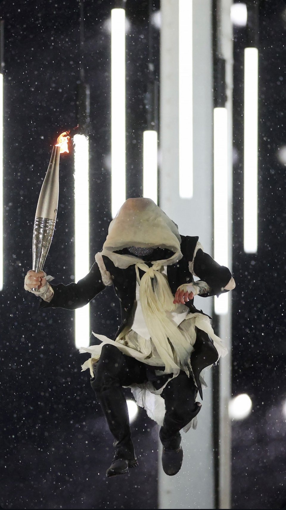 Δεν ξέρουμε ποιος κρύβεται πίσω από τη μάσκα της μυστηριώδους φιγούρας που κυκλοφορεί στο Παρίσι με τη δάδα των Ολυμπιακών Αγώνων.