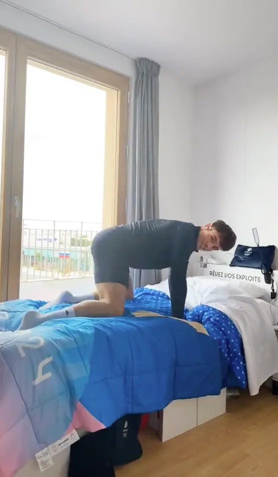 Ο Βρετανός δύτης Τομ Ντέιλι μοιράστηκε στον λογαριασμό του στο TikTok ένα βίντεο για να δώσει στους θαυμαστές του μια προσεκτική ματιά στα περιβόητα κρεβάτια, τα οποία φημολογείται ότι δεν είναι αρκετά ανθεκτικά για να αντέξουν σεξουαλική δραστηριότητα, ενώ οι διοργανωτές λένε ότι είναι φτιαγμένα από χαρτόνι για την ελάχιστη περιβαλλοντική επιβάρυνση.