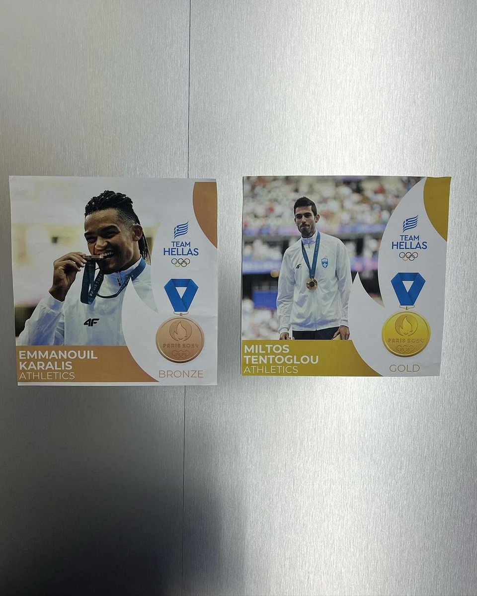 Δύο αφίσες στον τοίχο με τα πρόσωπά τους και τα ολυμπιακά μετάλλια, χρυσό για τον Τεντόγλου και χάλκινο για τον Εμμανουήλ Καραλή, ήταν το τέλειο σκηνικό για μία σειρά από χιουμοριστικές φωτογραφίες.