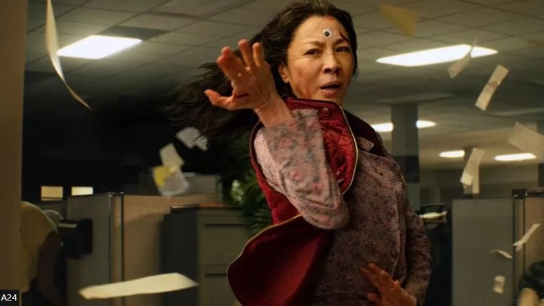 Όταν ο χαρακτήρας της χρειάζεται να αφομοιώσει τις πολεμικές τέχνες στο Everything Everywhere All At Once, χρησιμοποιεί μια κινηματογραφική εκδοχή της Evelyn, της οποίας η καριέρα βασίζεται στην ίδια την Yeoh.