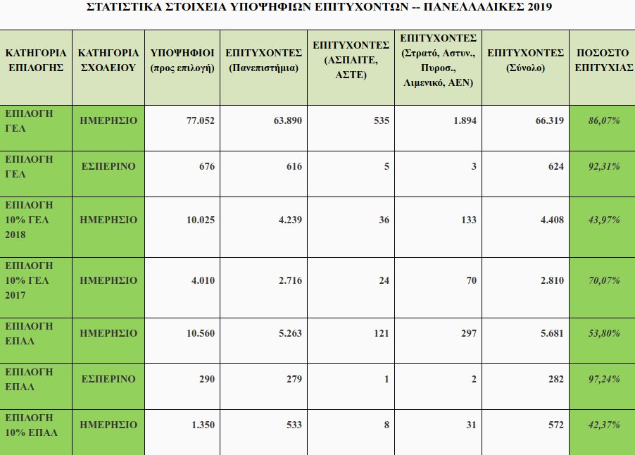 Συνολικά εισήχθησαν στα Πανεπιστήμια, στις Ανώτατες Εκκλησιαστικές Ακαδημίες, στην ΑΣΠΑΙΤΕ, στην ΑΣΤΕ, στις Στρατιωτικές και Αστυνομικές Σχολές και στις Ακαδημίες της Πυροσβεστικής, του Εμπορικού Ναυτικού και του Λιμενικού Σώματος 80.696 υποψήφιοι, ενώ το 2018 εισήχθησαν 77.510.