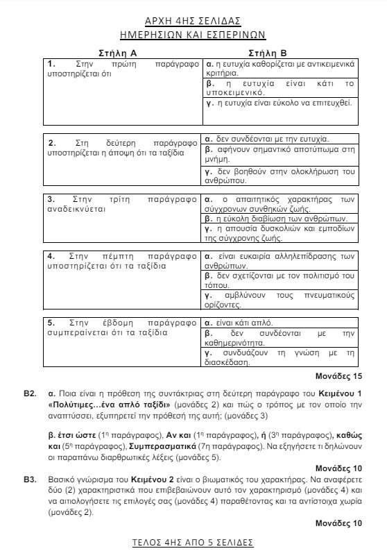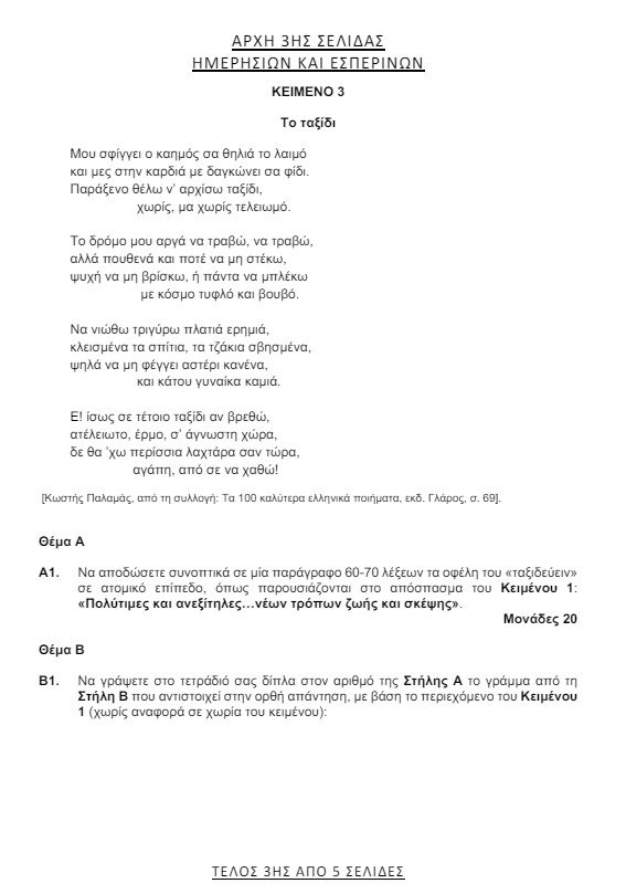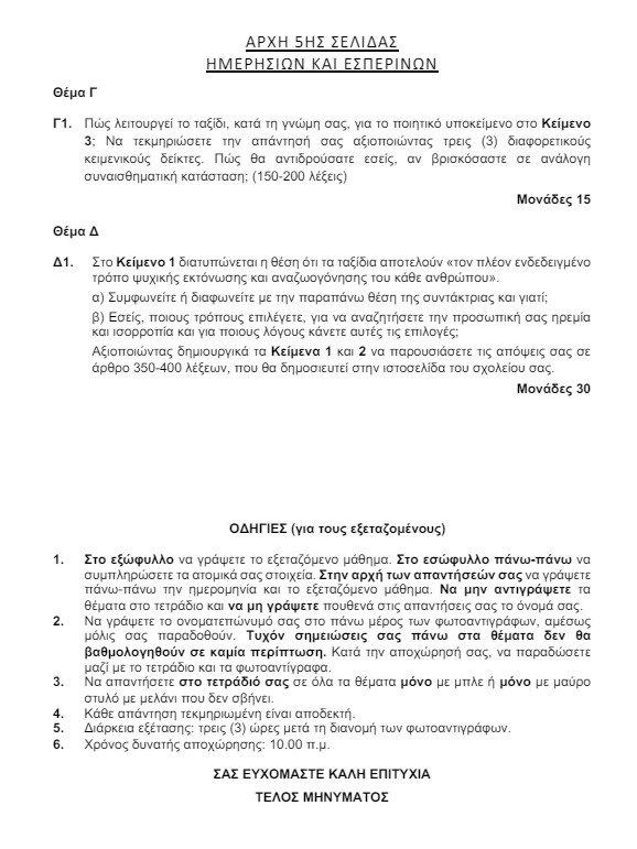 Τα ταξίδια, ως τρόπος ψυχικής εκτόνωσης και αναζωογόνησης ήταν το σημερινό θέμα των Πανελλαδικών κατά την πρώτη ημέρα των εξετάσεων, στο μάθημα της Νεοελληνικής Γλώσσας και Λογοτεχνίας.