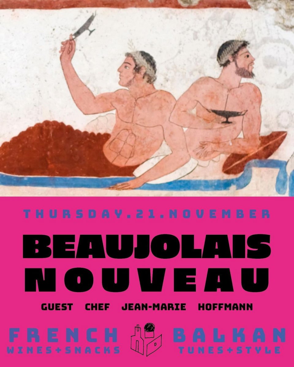 Ο σεφ της Γαλλικής Πρεσβείας Jean-Marie Hoffmann θα αναλάβει τις κατσαρόλες και τα τηγάνια δημιουργώντας γευστικά γαλλικά snacks ενώ η ομάδα του μαγαζιού θα επιμεληθεί μια λίστα κρασιών εμπνευσμένων από την ποικιλία Gamay. Την βραδιά θα συνοδεύει μουσικά μια ταιριαστή balkan playlist. Συνιστώνται οι κρατήσεις.