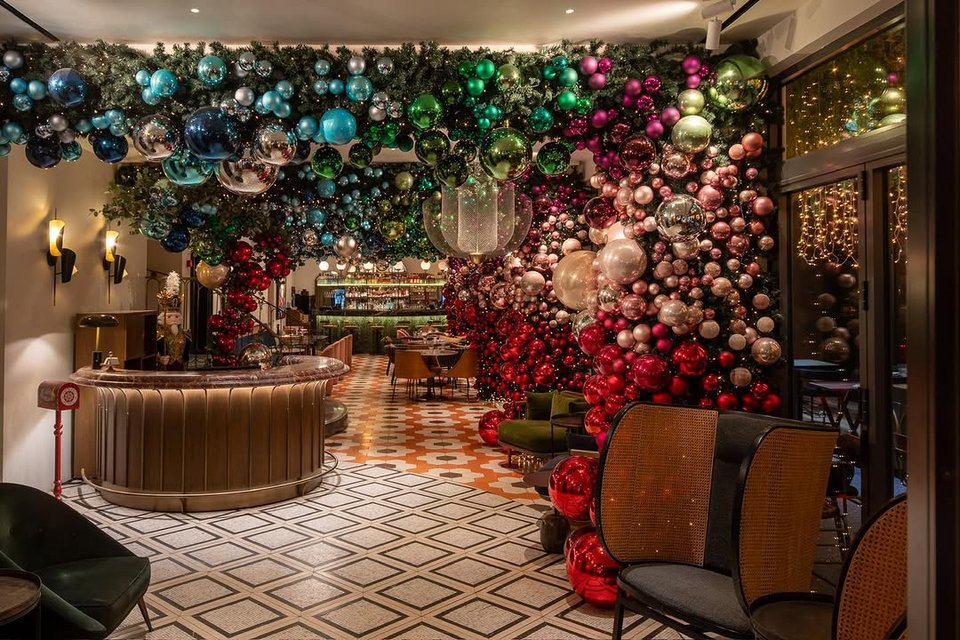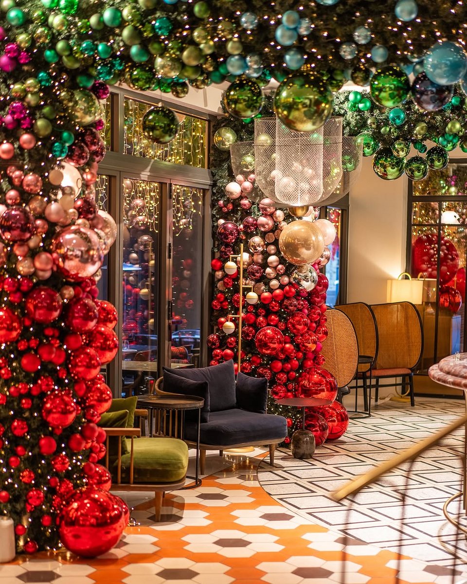 Το κομψό λόμπι του ξενοδοχείου ξεχειλίζει από γυαλιστερές μπάλες σε πολλά μεγέθη και χρώματα, όπως πράσινο, μπλε, κόκκινες, ροζ, μωβ κ.α. σχηματίζοντας ένα γιορτινό «ποτάμι».