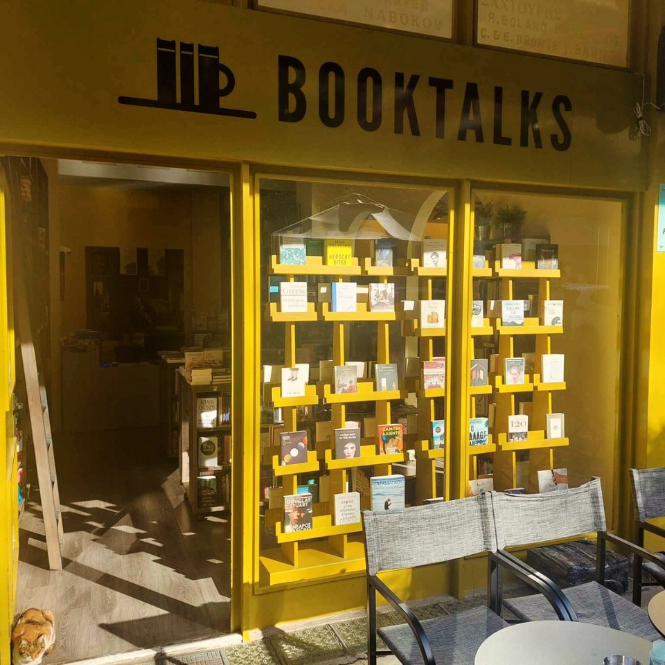 Μια υπέροχη, κίτρινη βιτρίνα σε καλωσορίζει στο Booktalks, για ατελείωτες συζητήσεις για βιβλία, όπως μαρτυρά και το όνομά του. Εκεί τα βιβλία ίπτανται και φτάνουν μέχρι το ταβάνι σαν στολίδια, ως μέρος της πρωτότυπης διακόσμησής του.