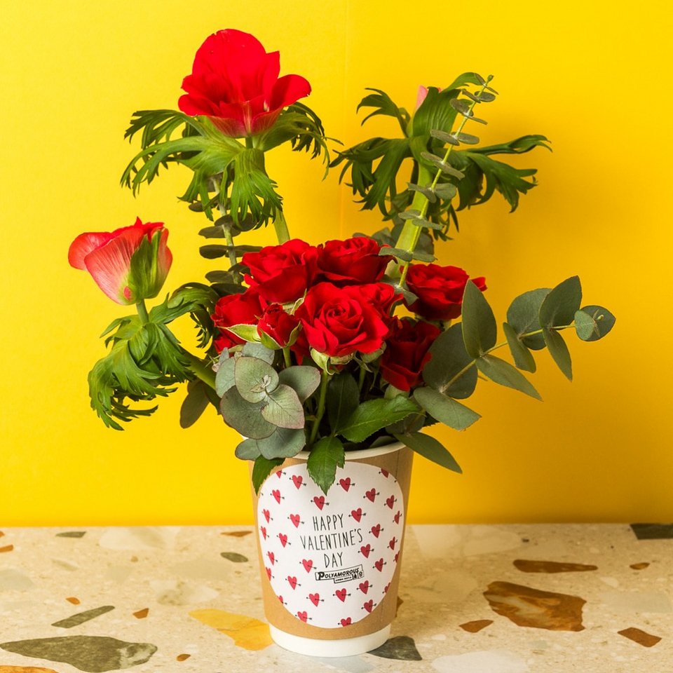 Για του Αγίου Βαλεντίνου μπορείτε να παραγγείλετε ένα μπουκέτο στο takeaway cup ή ένα σούπερ gift box που συνδυάζει το τρίπτυχο του: Άνθη, ποτά, παιχνίδια.