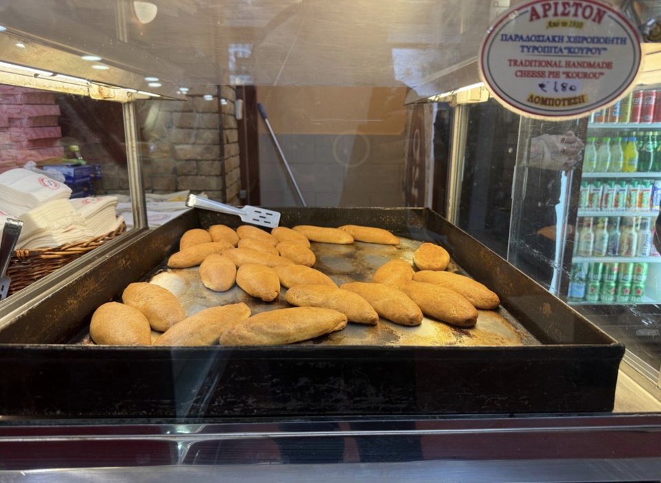 Καθώς μιλάμε, μια λαμαρίνα βγαίνει από τον φούρνο. Οι τυρόπιτες τρίζουν ακόμα από τη θερμότητα. Ο Δημήτρης τις κοιτά με την προσοχή κάποιου που δεν τις βαρέθηκε ποτέ.