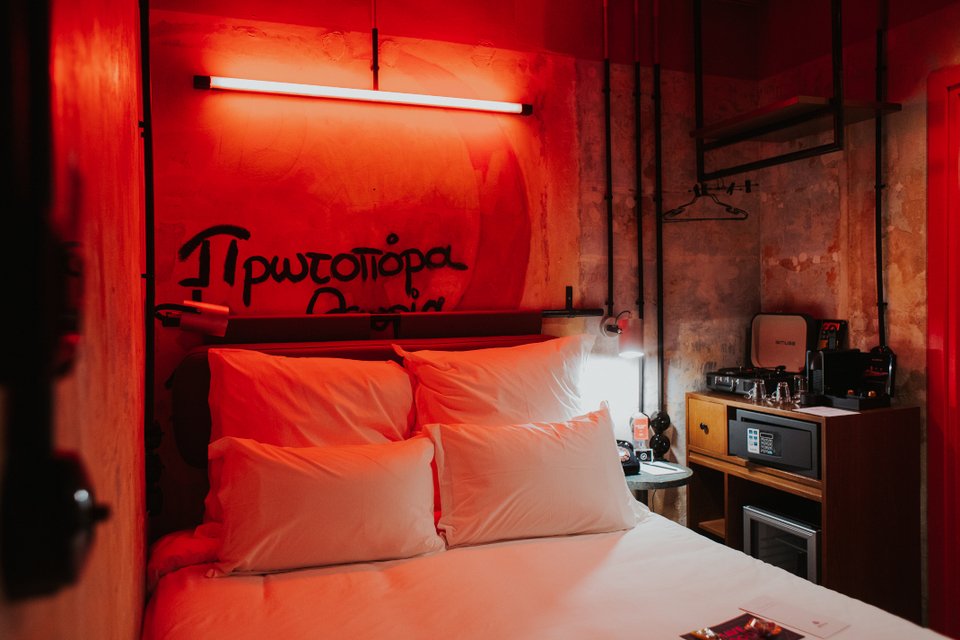 Το κόκκινο χρώμα κυριαρχεί μέχρι και στο όνομα του ξενοδοχείου, με το Dave Red Athens να δίνει έμφαση στα βιομηχανικά σχεδιασμένα δωμάτια με τα neon κόκκινα φώτα, τους γυμνούς τοίχους, προκειμένου ο κάθε επισκέπτης να γνωρίσει την underground πλευρά της Αθήνας.