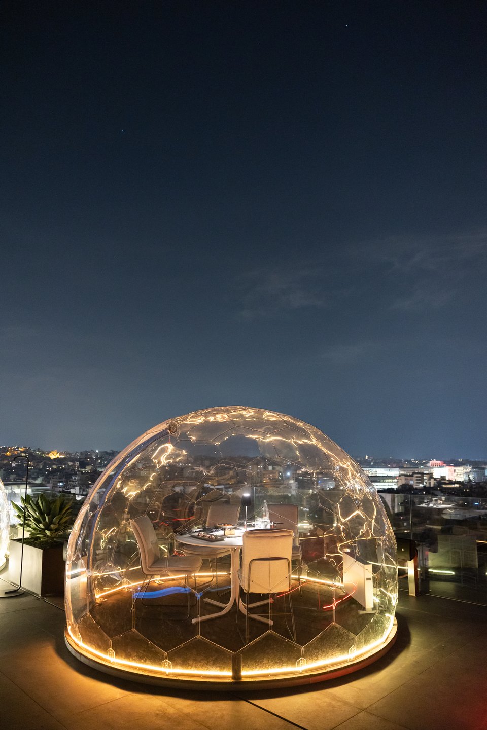 H τάση του ντιζάιν που κάνει θραύση στα ξενοδοχεία του Λονδίνου ήρθε και στην Ελλάδα: στο rooftop του νέου design hotel Neoma έχουν στηθεί ιγκλού για να απολαμβάνει κανείς το δείπνο του με θέα την Ακρόπολη, χωρίς να κρυώνει.
