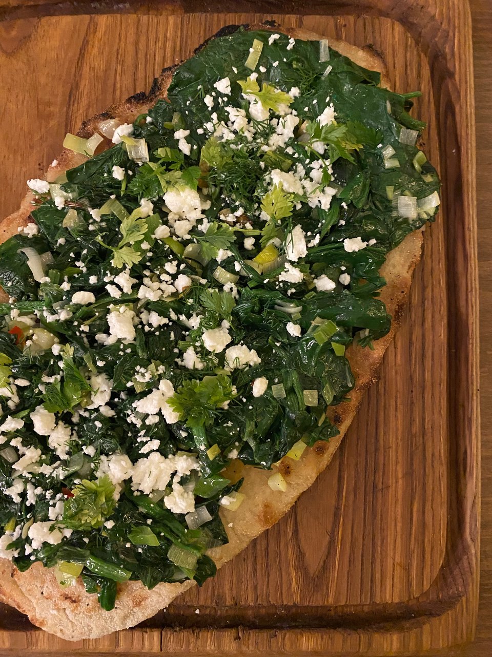 Η ανοιχτή σπανακόπιτα που ακολουθεί με το «σπαρταριστό» τραγανό σπανάκι και το φρέσκο κρεμμυδάκι πάνω σε ένα ωραίο flatbread, σβήνει την αψάδα που έχει το σπετζοφάι.