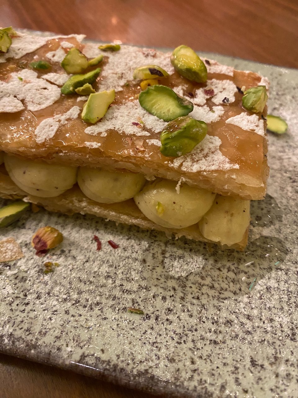 Τέλος, από τα γλυκά -πορτοκαλόπιτα, εκμέκ τσουρέκι και μπακλαβάς μιλφέιγ-, ξεχώρισα το τελευταίο με μια κρέμα-κόλαση με ολόκληρα φιστίκια Αιγίνης και παχιά φύλλα σφολιάτας που κόβονται με ινσταγκραμικό ήχο. Εφετζίδικο γλυκό και στο μάτι και στη γεύση, που είναι από μόνο του λόγος (μαζί με το ζουμερό εθιστικό κοτόπουλο και την τηγανιά μαύρου χοίρου) να έρθω ξανά μια βόλτα από την Elea.
