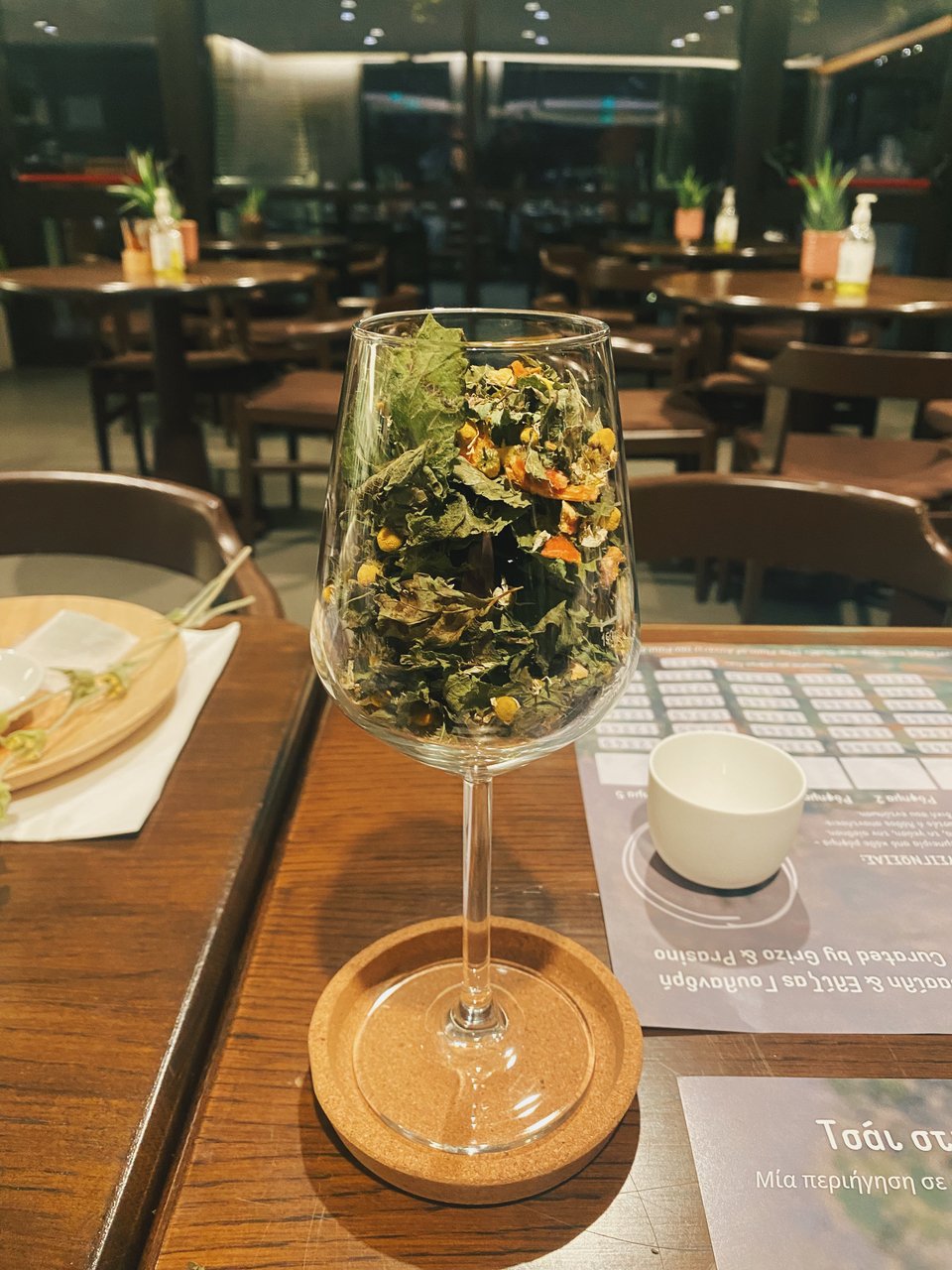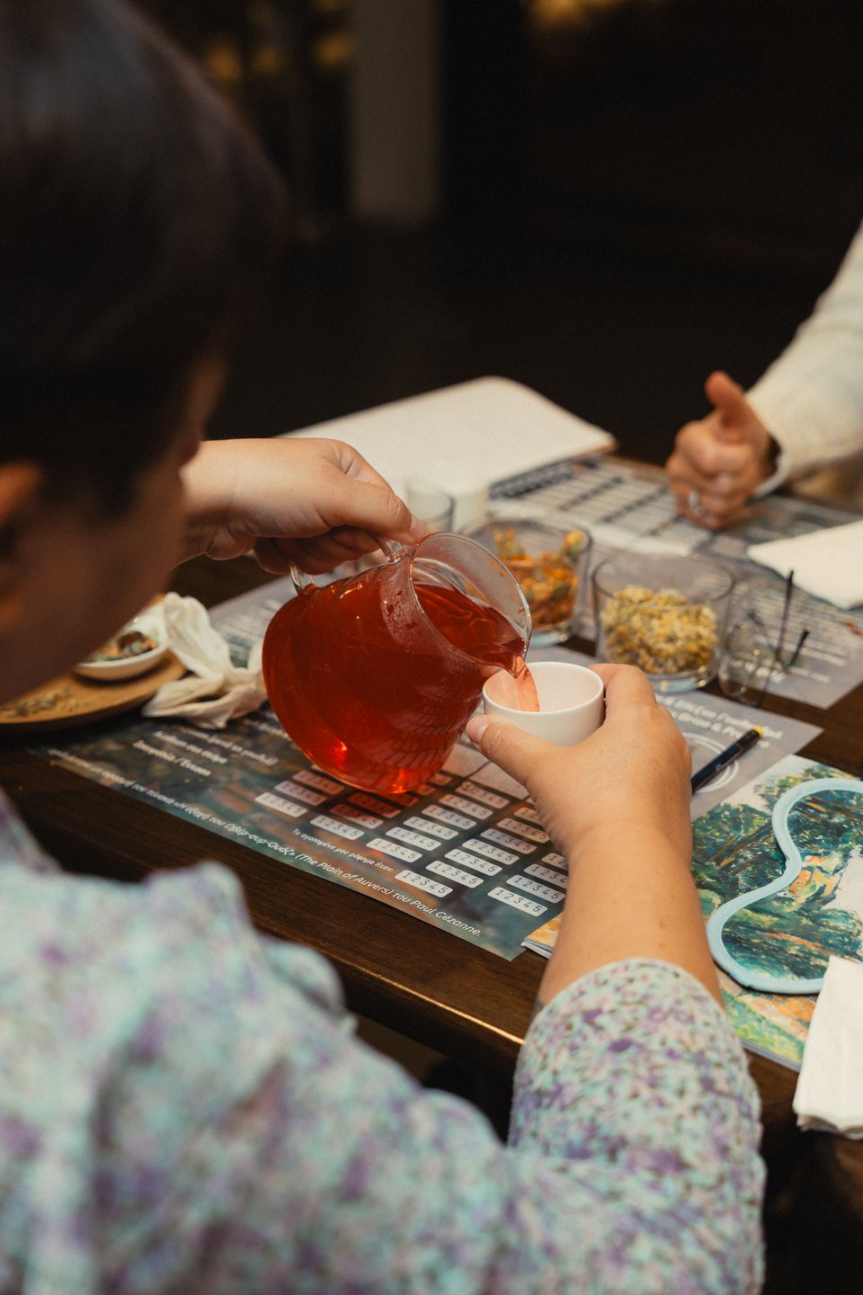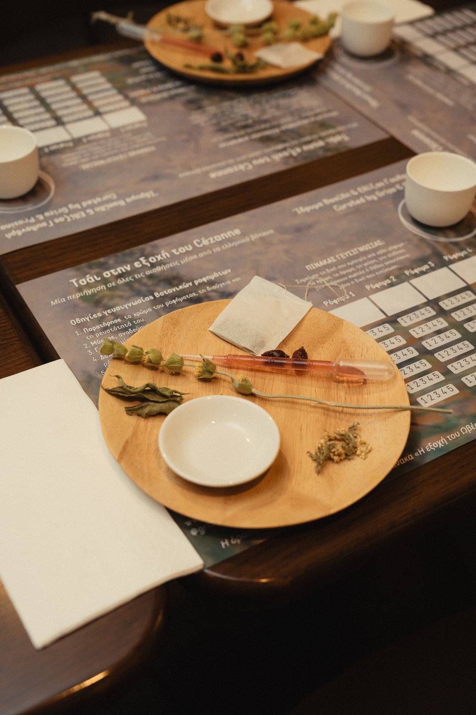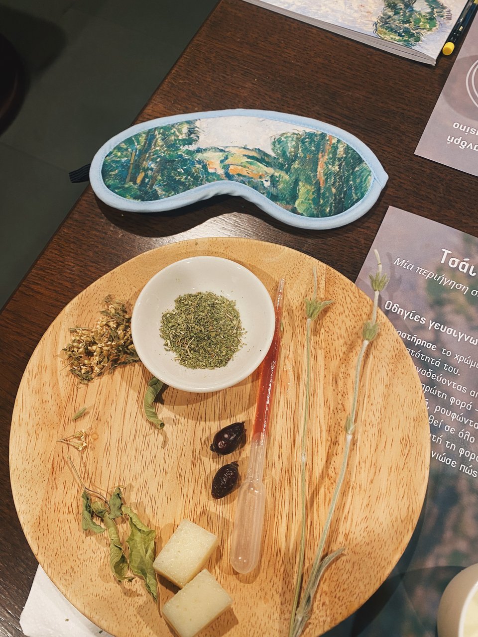 Επί δυόμισι ώρες, από τις 19.00 έως τις 21.30, δοκιμάσαμε με ανοιχτά ή κλειστά μάτια -φορώντας μάσκες ύπνου ντυμένες με το μοτίβο του Σεζάν- βοτανικά μείγματα, προσπαθώντας να εντοπίσουμε τα βασικά ελληνικά βότανα από την επίγευση και το άρωμα που αναδίδουν.