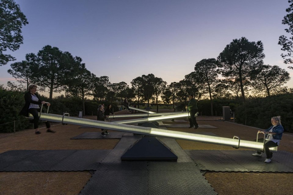 Φωτεινές μουσικές τραμπάλες, καθεμιά με το δικό της μουσικό λεξιλόγιο και τη δική της «ιδιοσυγκρασία», περιμένουν να παίξετε μαζί τους σε μία αισθητηριακή παιδική χαρά βγαλμένη από το μέλλον. Καθώς κινούνται οι τραμπάλες ξεσπούν σε μία αυθόρμητη και αυτοσχέδια μουσική σύνθεση δημιουργώντας ένα μοναδικό κάθε φορά ηχοτοπίο.