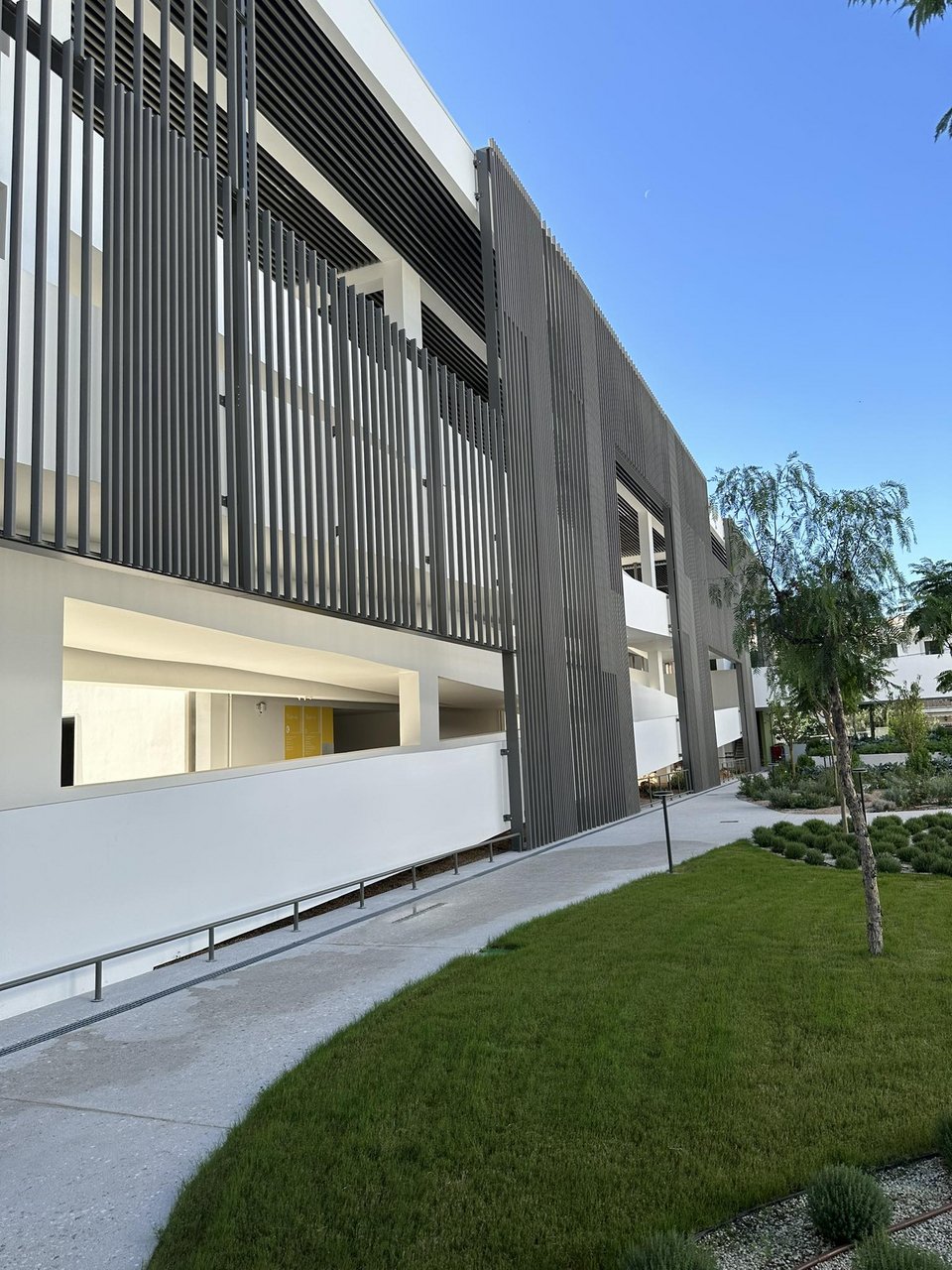 Συνεχίζοντας το ίδιο γραφείο κοντά στον Aλιμο σχεδιάζει έναν άλλον συνδυασμό κτιρίου με στρογγυλά μπαλκόνια και μια ενιαία πέργκολα στο ισόγειο που διαμορφώνει ιδιαίτερες συνθήκες σκίασης και ωραία στοιχεία φωτισμού και πράσινου. Συνολικά 79 διαμερίσματα, όλων των τυπολογιών -από ένα υπνοδωμάτιο έως και τέσσερα - με τετραγωνικά που κυμαίνονται από περίπου 60 μέχρι και 200.