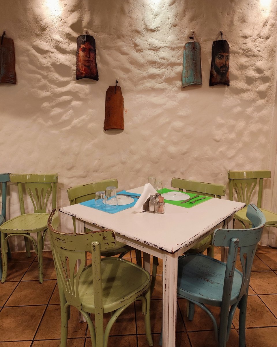 Μεταφερόμαστε μέσα, στη δίχωρη, απλωμένη σάλα του που αποπνέει θαλπωρή προσφέροντας τις ανέσεις ενός σύγχρονου μεζεδοπωλείου με πολύχρωμα, ξύλινα τραπεζάκια και καρέκλες, διάχυτο φωτισμό, πέτρινους τοίχους και ελληνικές μουσικές να παίζουν στο background.