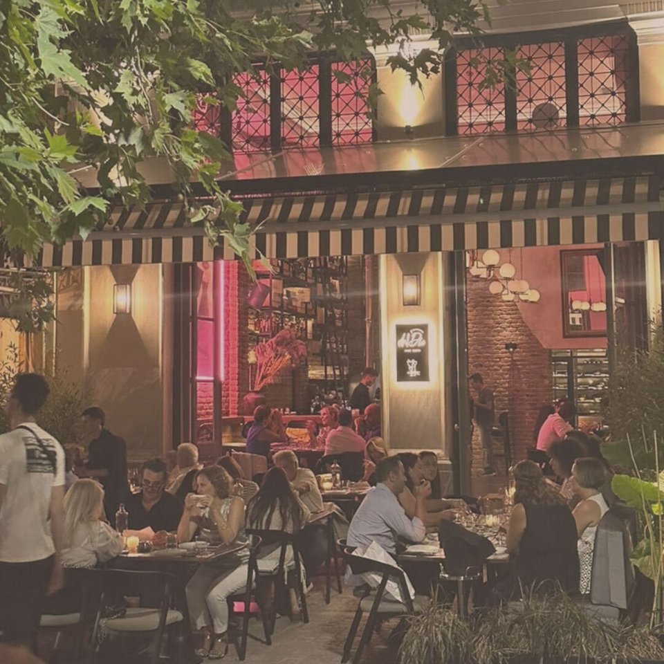 Πέτρινοι τοίχοι με καφέ τούβλα, urban λεπτομέρειες, υφές ζεστού ξύλου αλλά και επιβλητικού μετάλλου, κομψά τραπέζια και καρέκλες με βιεννέζικη ψάθα, μοντέρνος φωτισμός και μια τεράστια ραφιέρα με μπουκάλια κρασί και άλλα αποστάγματα συνθέτουν το ατμοσφαιρικό, σχεδόν θεατράλε σκηνικό που θα έκανε περήφανη την μεγάλη πριμαντόνα της όπερας. Την παράσταση κλέβει και το κελάρι με την floor-to-celling κάβα κρασιών.