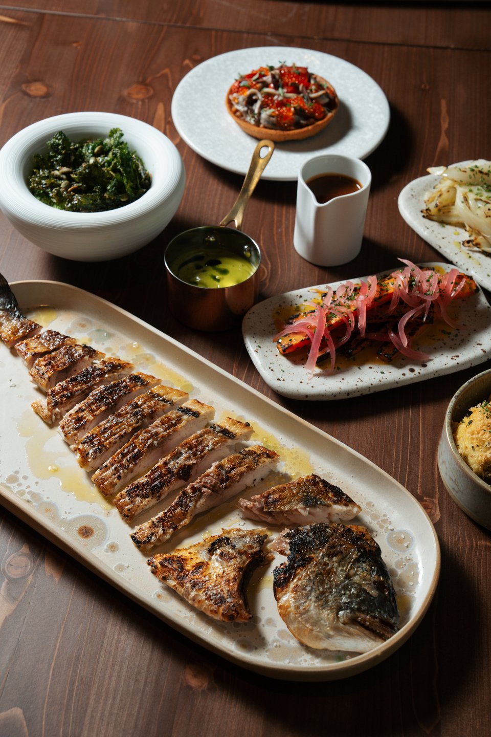 Η προζυμένια φοκάτσια με το λεμονάτο-μπαχαράτο ελαιόλαδο έρχεται αμέσως ενώ στη συνέχεια τα μελωμένα καροτάκια με γιαούρτι και μείγμα ντούκα αλλά και το σαγανάκι με κατσικίσιο τυρί και μαρμελάδα ντομάτας. Το ταρτάρ αλλά και οι σαλάτες με τους ξηρούς καρπούς, συνοδεύουν τέλεια τα πιάτα που έρχονται.