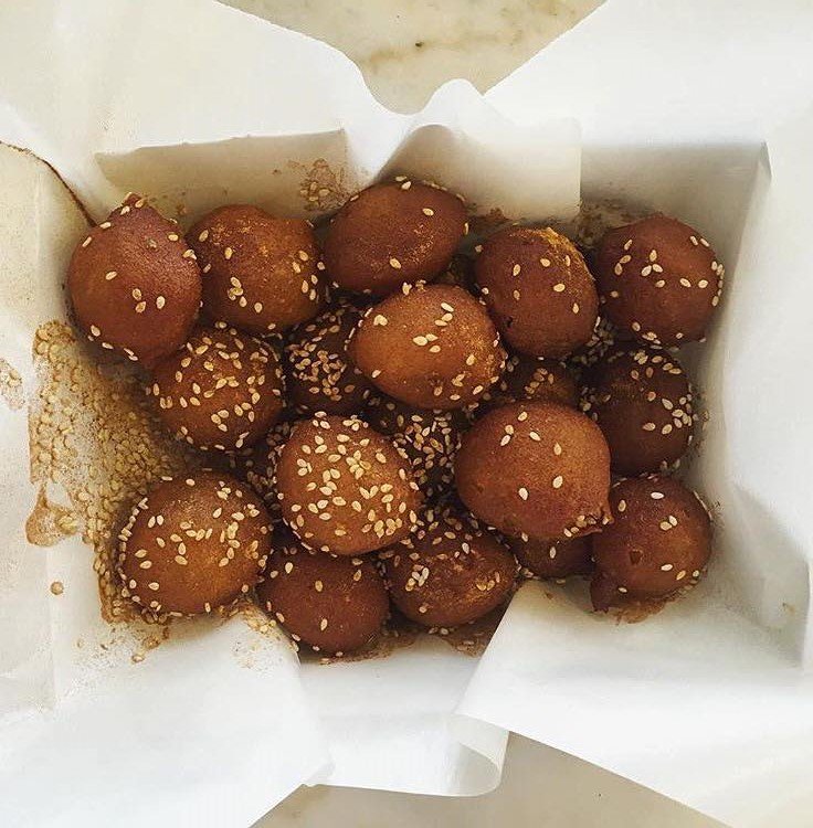 Τα συνοδεύει με γερή δόση μελιού, κανέλα και σουσάμι και γίνονται κυριολεκτικά μια χαψιά ενώ τρώγονται ιδανικά σε θερμοκρασία δωματίου. Έρχονται σε μεταλλικό πιατάκι, όπως παλιά.