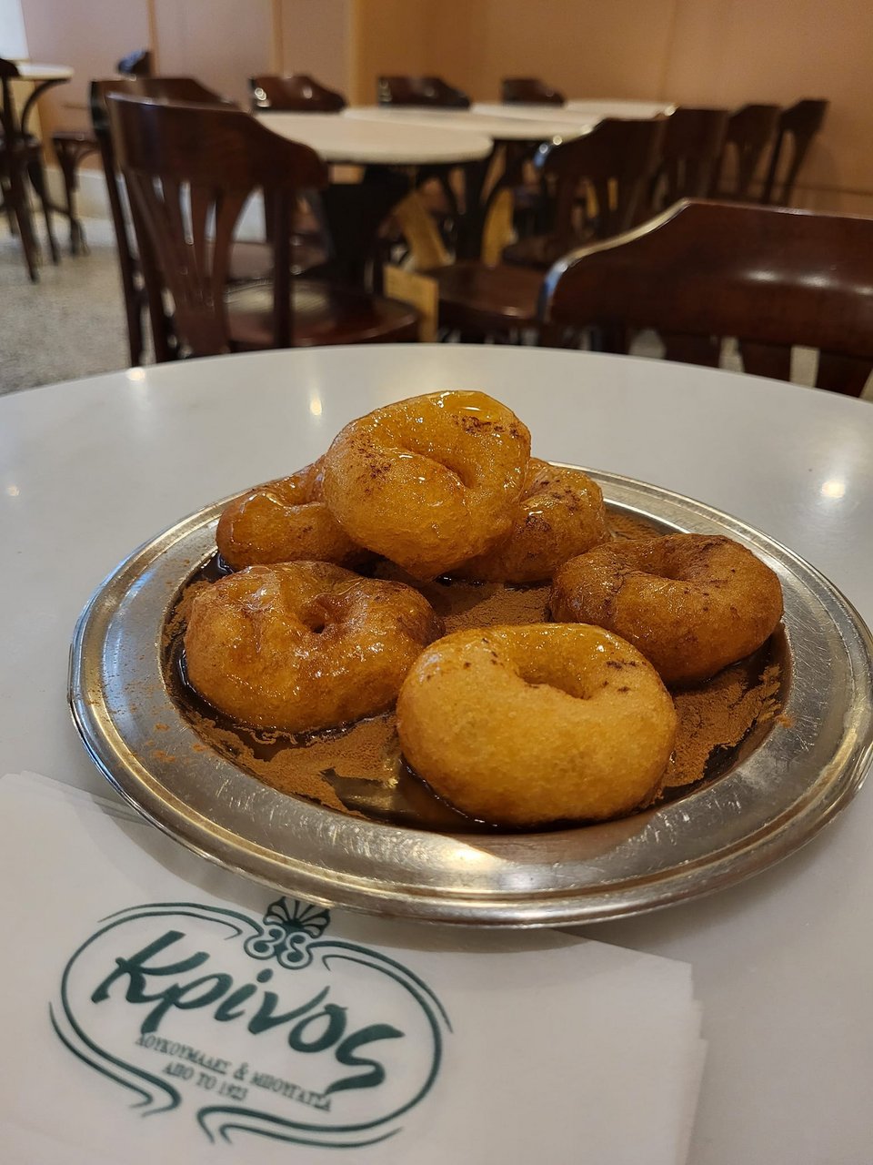 Εκεί θα βρεις τους περίφημους, στρογγυλούς λουκουμάδες με την τρύπα στην μέση, σαν δαχτυλίδι, χρυσαφένιους και τραγανούς απ' έξω, αφράτους και μαλακούς από μέσα. Σερβίρονται με μπόλικο θυμαρίσιο μέλι και κανέλα, ενώ πλέον μπορείς να βρεις και με πραλίνα.