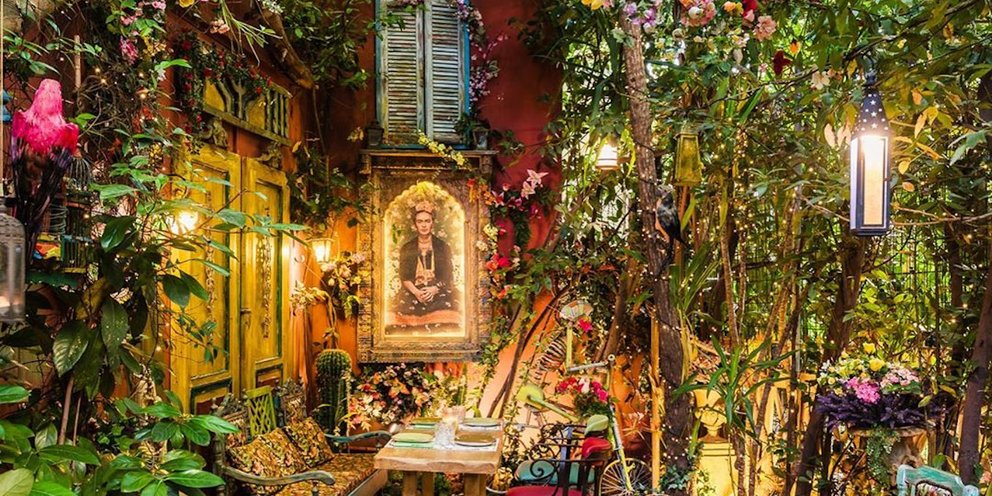 Σκούρο ροζ χρώμα στους τοίχους, ζωγραφισμένοι κάκτοι σε μεγάλες γλάστρες, τραπέζια επίσης ζωγραφισμένα στο χέρι, έθνικ υφάσματα, μπαρ από μπαμπού, ρετρό πολυθρόνες, δερμάτινοι καναπέδες, vintage πίνακες, αντίκες και μια πελώρια τοιχογραφία της ζωγράφου Φρίντα Κάλο στην υποδοχή, περιτριγυρισμένη από λουλούδια σε έντονα χρώματα (όπως αυτά που ζωγράφιζε η ίδια για να μην πεθάνουν) συνθέτουν ένα μοναδικό τροπικό σκηνικό!