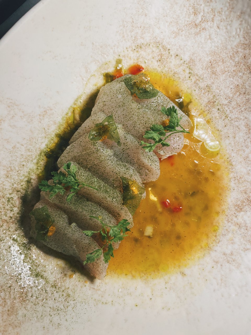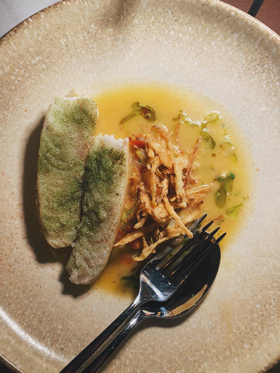 Το ημίπαστο ψάρι ημέρας -μυλοκόπι στη δική μας περίπτωση- ήταν από τα ωραιότερα πιάτα της βραδιάς, με την τρυφερή σάρκα του ψαριού να κολυμπά με πιπεριές, φύκια, τζίντζερ και πίκλες αγγουριού, όλα σε ζύμωση, σε μια φίνα βινεγκρέτ από λάδι, φύκια και μυρώνια, ενώ στη βάση του πιάτου υπάρχει μια γευστικότατη κρέμα από ταραμά.