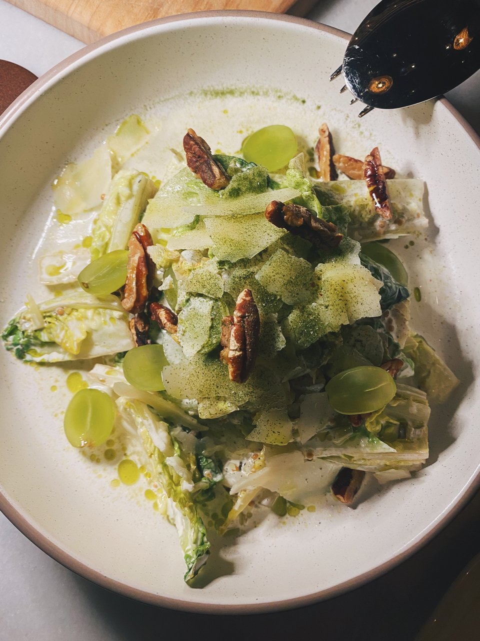 Από σαλάτες επιλέξαμε μια πράσινη: τη δροσερή και ντελικάτη Baby Gem με καρδιές μαρουλιού με μια μαγιονέζα από αγγούρι σε ζύμωση, τηγανητά πεκάν, σταφύλι, σκόνη από φύκι και παλαιωμένη γραβιέρα Ρεθύμνου.