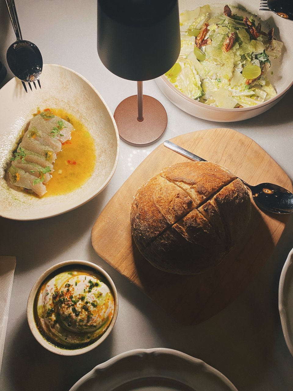 Ξεκινήσαμε με το χειροποίητο προζυμένιο ψωμί: ένα καρβελάκι κομμένο στα τέσσερα που έρχεται ζεστό στο τραπέζι μαζί με έναν απολαυστικό και ελαφρύ ταραμά, με σκόνη από κρεμμύδι, λάδι, σχοινόπρασσο και τσίλι.