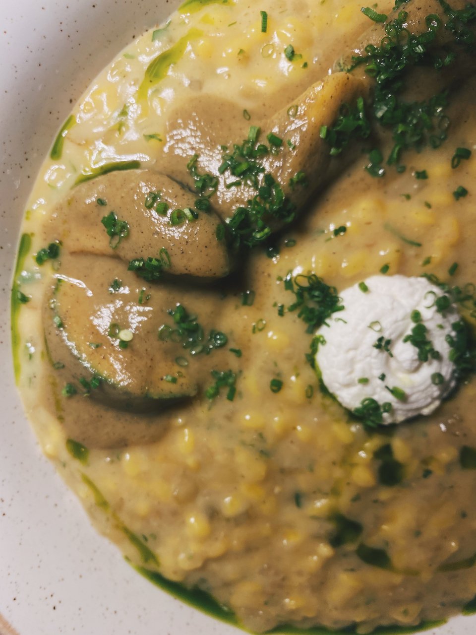 Γευστικό και το βιγκανιστικό κριθαράκι με κρέμα βασιλικού και καμένα κολοκύθια, που μέχρι στιγμής έχει γίνει το best seller του Scarlet.
