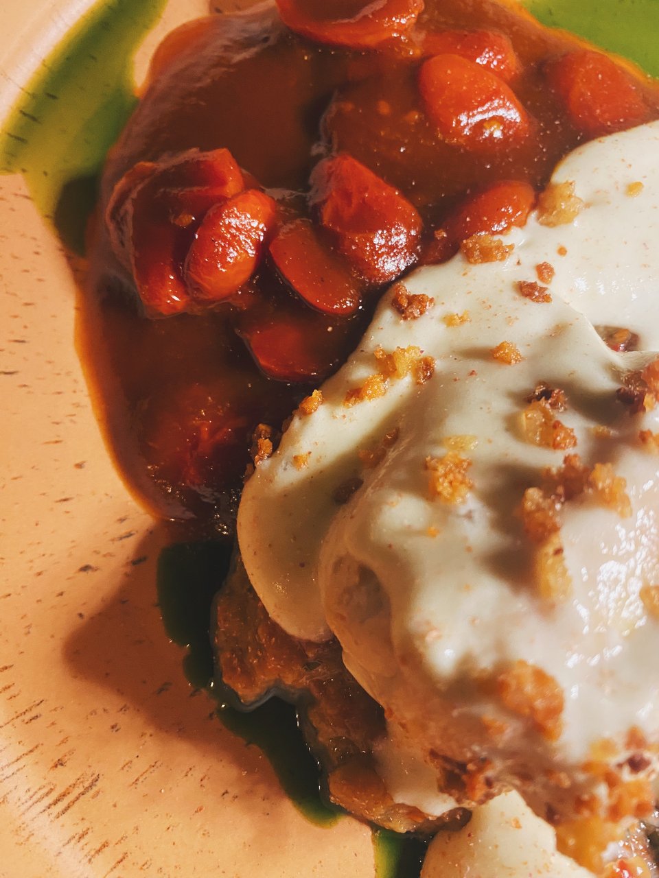 Κλείσαμε με το πιάτο του κόκορα ελευθέρας βοσκής από τη Ναύπακτο: ένα τρυφερό φιλέτο με αγιορείτικη μελιτζανοσαλάτα, κρέμα από πατάτα και πράσο, τηγανητό τραχανά και στο πλάι μια χειροποίητη BBQ με ντοματίνια κονφί.