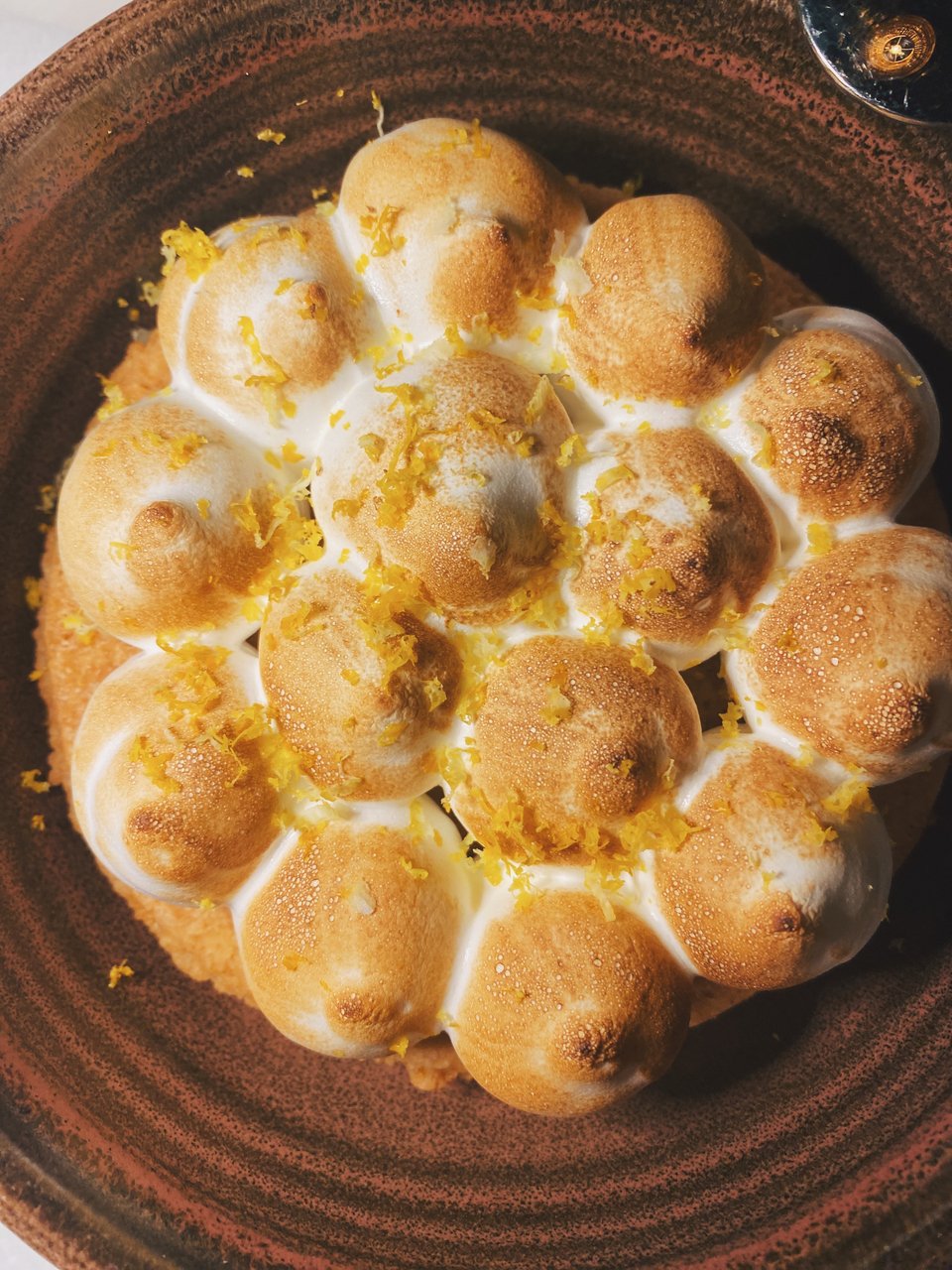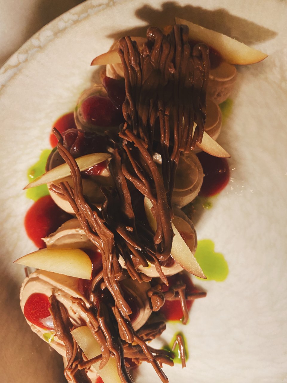 Μους σοκολάτας με στικ σοκολάτας, βανίλια σε τρεις μορφές (τσάτνεϊ, πίκλα και φρέσκια) και κραμπλ αμυγδάλου. Τέλος, μια εθιστική lemon pie.