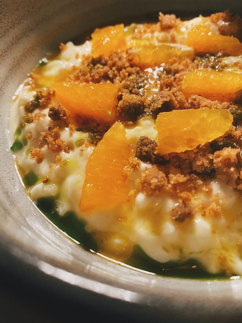 Τα γλυκά ήταν μια τριλογία από: ρυζόγαλο με κραμπλ πεκάν, μαρμελάδα πορτοκαλιού, λάδι από βασιλικό και φρέσκο πορτοκάλι.
