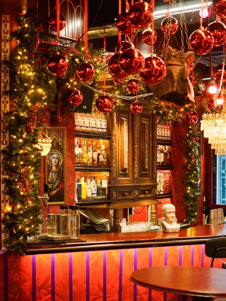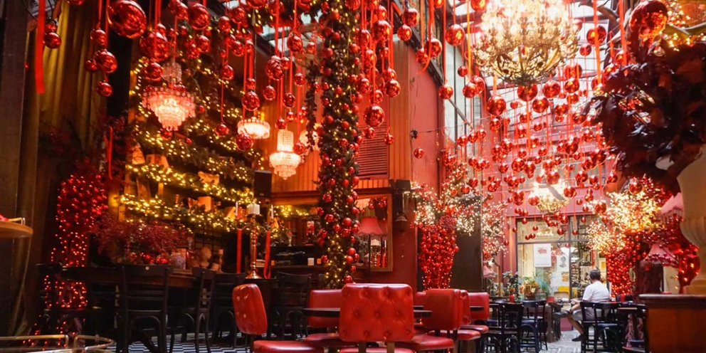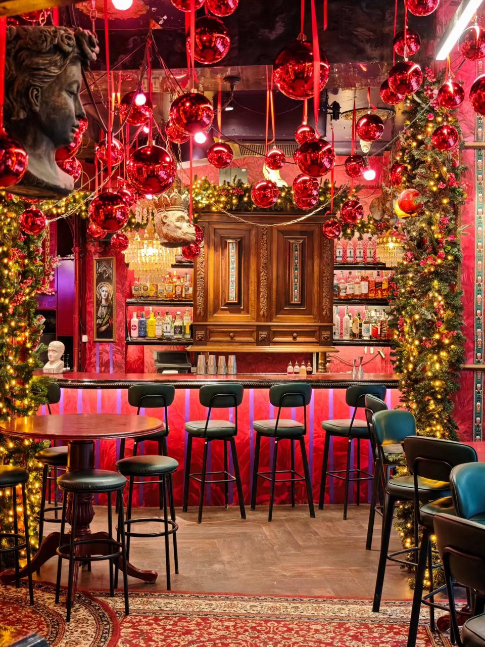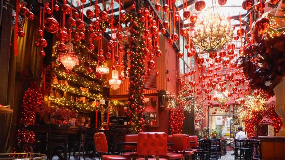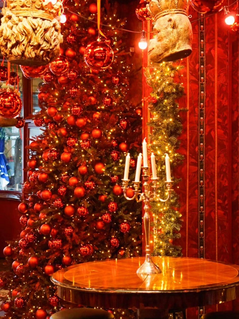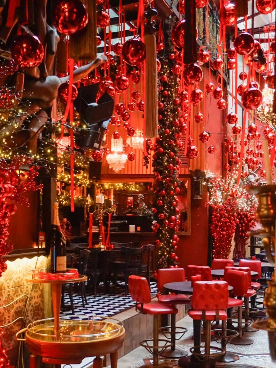 Η διακόσμηση είναι κατακόκκινη με λαμπερές μπάλες και γιρλάντες να κρέμονται από το ταβάνι, κλαδιά δέντρου και λευκά φωτάκια να βρίσκονται παντού στον cozy χώρο, κόκκινα κεριά και γκι να κοσμούν τα τραπέζια...
