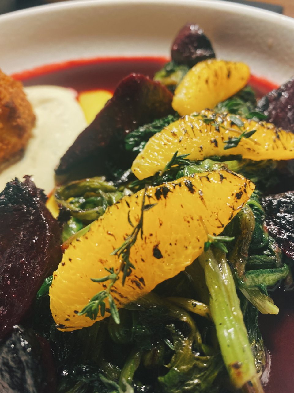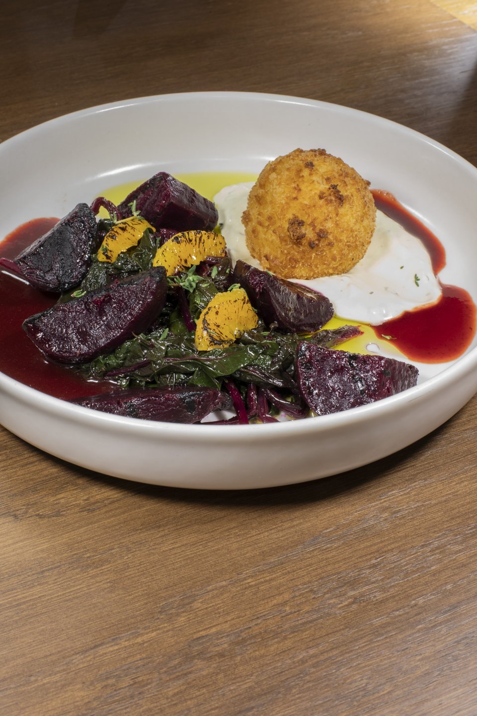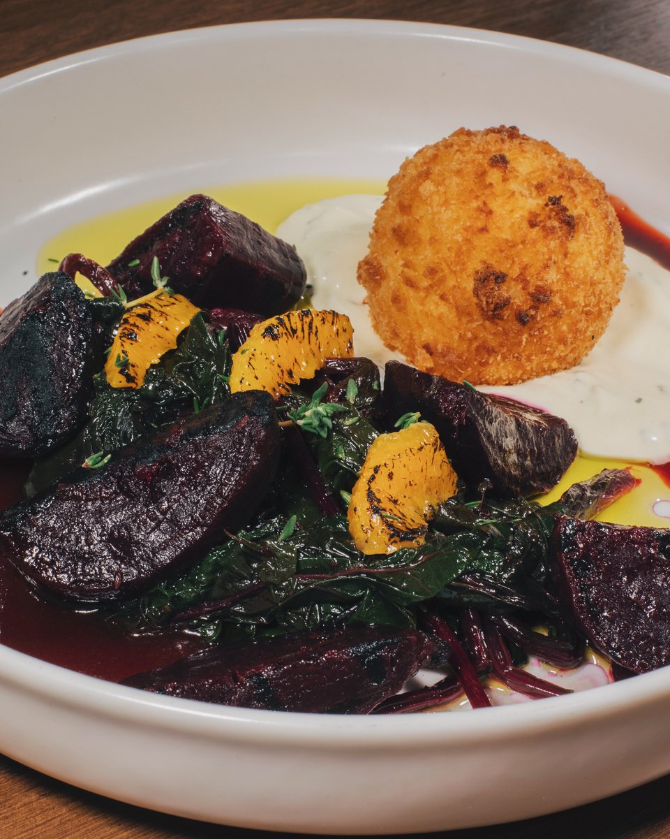 Το ψητό παντζάρι με τα παντζαρόφυλλα που έχουν περάσει κι αυτά από τη σχάρα, πάλι, είναι λιγότερο μπρουτάλ. Είναι σαν πίνακας ζωγραφικής με το καμένο πορτοκάλι και με μια πορφυρή σάλτσα μέσα στην οποία, σαν βράχος, επιπλέει μια κροκέτα κατσικίσιου τυριού που της σπας με το πιρούνι και γίνεται γιορτή!